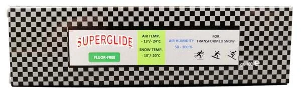 Fluor-free top level skiing glider developed for transformed snow and air humidity 50-100% at snow temperature –10°/-20°C and air temperature -13°/-24°C.
